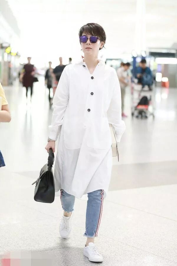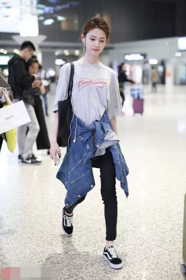 怕自己腿粗的妹子,最近可以像陈瑶一样这么穿,即用一件牛仔衬衫系在腰间可以间接遮住大腿上的肉肉哦。