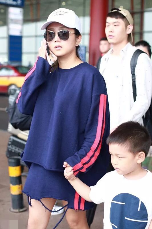 最近现身机场的何洁穿一套藏蓝色红条纹运动装,除了裙子的毛边比较独特,这套穿搭难得的低调。
