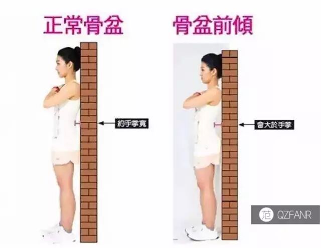 之前范姐在《女人的腿并不拢意味着什么》中讲过如何判断自己骨盆前倾的问题:按照自己平时的站姿靠墙站里,如果腰部和墙壁的缝隙大于一个手掌的距离,说明骨盆前倾了。