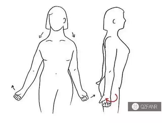 有一个舞蹈老师告诉范姐,她们以前练习形体的时候,为了让姑娘们身姿挺拔,会要求她们用双臂夹住一根竹竿在背后。(网上实在没找到图片,范姐只好自己画了,你们把这跟红线当成竹竿就好。)