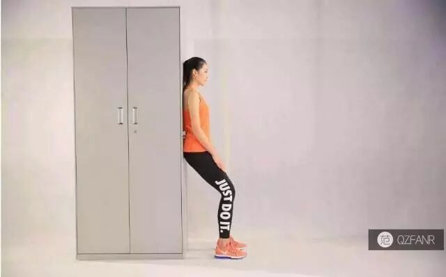 如图中所示,腰部紧贴墙壁,身体呈半蹲姿势,这样不仅可以让骨盆后倾,还能锻炼腿部肌肉哦。每天做3组,每次做5分钟,可以配合手部对肩胛骨的训练,效果更好。