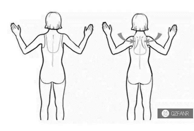 将自己的肩膀下降放松,双手往外旋转至图中第二个女孩所示的角度。每天做3-5组,每组保持20秒钟。