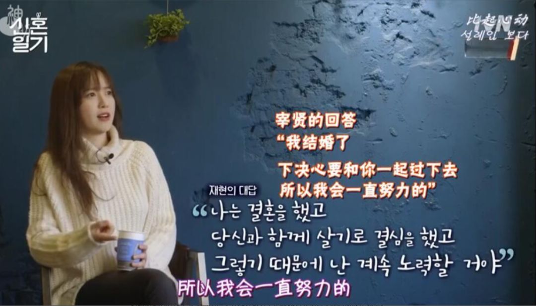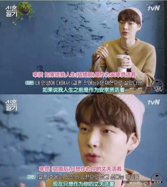 “想要哪怕是早一天,和这个人进行结婚纪念;想要哪怕是早一天,也想和这个人创造回忆,想要快点拥有1周年、2周年、10周年、30周年。” “如果说我人生之前是作为安宰贤活着,现在只想作为你的丈夫而活着”。