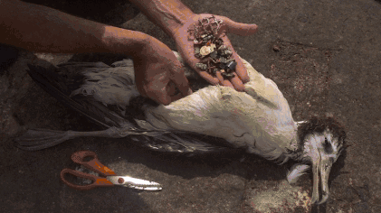 这是一只已经死去的信天翁,它的肚子里面藏着的是各种塑料瓶盖、吸管、牙刷、甚至还有锋利的硬片。