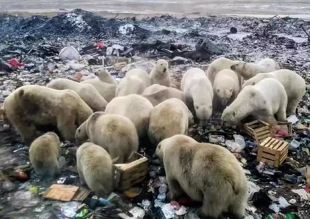 附近的冰山早已融化,它们只能在垃圾堆中,苟延残喘。