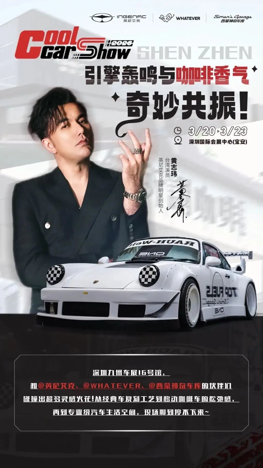 英尼艾克明星创始人黄志玮空降CoolCarShow,请你喝一杯引擎特调,为中国汽车文化加点料! CoolCarShow 港台男星 2026-03-19 17:44:10 31 创作不易,用心坚持,欢迎请BaGua喝几杯爱心咖啡!打赏并支持本文 打赏并删除本文 ↑点击上方图片报名参会↑ 谁的青春 DNA 动了?还记得《仙剑三》魔尊重楼的黄志玮吗?这次他不做荧幕反派,而是以英尼艾克明星创始人的身份,在3月20日-3月23日,携手汽车后市场连锁品牌英尼艾克和吴彦祖的WHATEVER咖啡一同参加CoolCarShow 2026 深圳改装车展。英尼艾克INGENAC是2017年创立的汽车后市场连锁品牌,以“匠心、极致”为核心品牌理念,聚焦高端洗车、汽车美容、贴膜养护等车主需求,为车主提供专业、高品质的汽车服务,同时依托成熟的服务体系,打造兼具专业与温度的车主体验空间,还通过跨界融合多元生活方式,为车主带来更丰富的汽车生活体验。英尼艾克拥有行业成熟的全链路服务体系,携手美国伊士曼、KLCB(苛力)等国内外一线品牌打造优质供应链,从耗材选品到服务流程均遵循高标准把控,让车主享受专业、靠谱的汽车养护体验。品牌更不断探索汽车生活新可能,通过跨界合作、明星合伙人联动等方式,打破汽车服务的单一边界,为车主打造有质感、有温度的汽车生活圈。黄志玮(Jerry)是来自中国台湾,集演员、模特、主持人于一身的多栖艺人,2009 年因《仙剑奇侠传三》中「魔尊重楼」一角爆火,后续参演《一起来看流星雨》、《四海重明》、《狐妖小红娘》等作品,塑造了多个立体反派角色,近年更涉足短剧领域,演绎更多复杂人物,演技持续突破。作为深耕汽车领域的资深车迷,黄志玮早已不只是荧幕上的演员,2025年他正式加入汽车后市场连锁品牌英尼艾克成为联合创始人,从演艺事业跨界实业创业,亲身践行“明星+实业”的新路径,把自己对汽车的热爱,变成了实打实的专业服务。黄志玮一句“让汽车不只是工具,更是承载热爱生活的方式。”戳中无数爱车人的心,这次他把汽车改装的热血与咖啡的暖心深度融合,亲手打造「引擎特调」咖啡,邀所有车友一起,为中国汽车文化加点料!值得关注的是,西蒙神奇车库(Simon's Garage)也会把他们的RWB 911(930)带到活动现场。相信大家对这台深圳本土的RWB 911再熟悉不过,这次参加CoolCarShow将会与WHATEVER咖啡和英尼艾克一同合作,为大家展示它的最新形态,将汽车文化融入潮流和生活之中。3月20日,来CoolCarShow 2026 深圳改装车展16号馆WHATEVER咖啡 x 英尼艾克INGENAC展台,找我们的一日店长黄志玮喝「引擎特调」,打卡吴彦祖的氮气引擎咖啡,感受汽车改装与咖啡文化的跨界融合,解锁爱车生活的全新打开方式!各位想要与吴彦祖和成康近距离互动的粉丝和车迷千万不要错过,抓紧时间打开「CoolCarShow官方商城」小程序购买STUDENT DRIVER x CoolCarShow 2026 官方限定明星互动套装,目前明星纪念合影套装、明星签售套装和明星合影套装均已售罄,还剩余少量明星见面会套票,欲购从速!( 最终参与名单解释权归STUDENT DRIVER和CoolCarShow所有。 )⇡立即点击购买⇡了解汽车改装市场趋势想加入CoolCarShow大家族吗?扫扫图中二维码即可入群哦!↓↓↓点点赞点分享点在看 创作不易,用心坚持,欢迎请BaGua喝几杯爱心咖啡!打赏并支持本文 打赏并删除本文 感谢您的支持鼓励,我会继续努力的!文章地址:用户邮箱:打赏金额:USDT 请输入数字点击”去打赏“,即可进行打赏支持本文章哦 黄志玮 发表评论