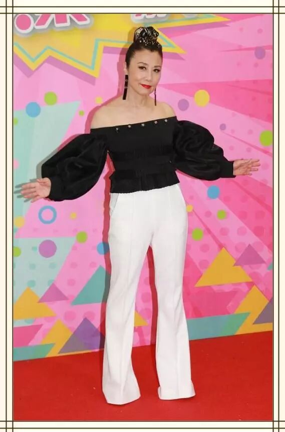 汪明荃的穿搭不得不说也是紧跟潮流的啊,这件一字领的黑色上衣非常显人精神,而且很是修饰肩型,让肩膀看起来十分的优美,露出了汪明荃精致好看的锁骨,衬的她脖子十分的修长,泡泡袖的设计让人眼前一亮,简直是减龄必备,让汪明荃看起来就像是20多岁的少女一样青春,还有这拖地长裤,穿上立马看起来腿长一米八。