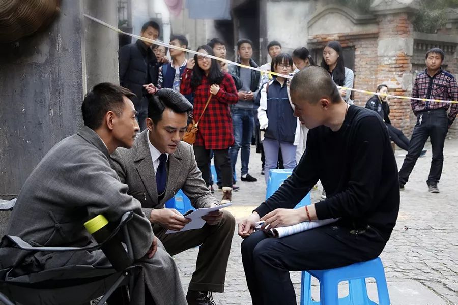 ▵《伪装者》片场导演李雪(右)给王凯(中)及其他演员讲戏 图/电视剧《伪装者》官微