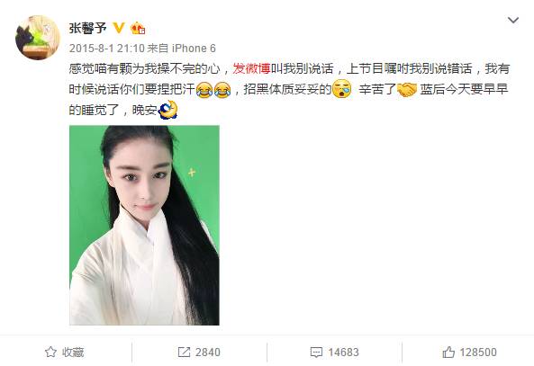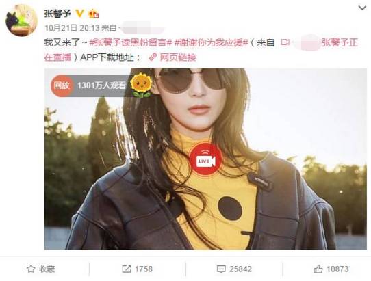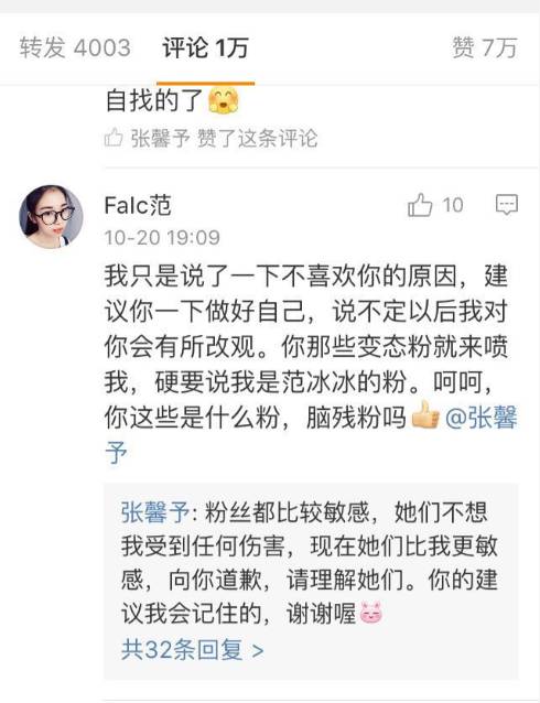 哎,张馨予虽然一路被黑一路火,但是她还是对微博爱得深沉,微博天天更新而且还常常和粉丝互动,不止一次见她在评论中给粉丝回复点赞。想必每天也是会看到黑粉们的。