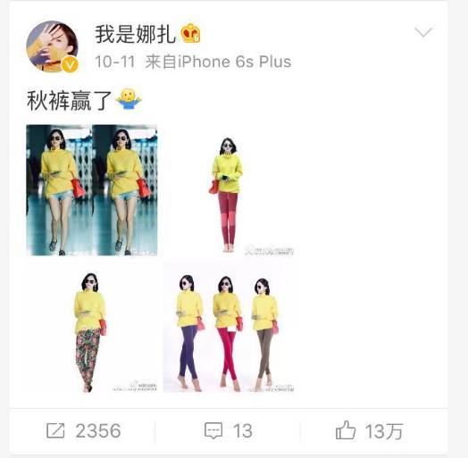现在的娜扎应该是真有这样的好心态了,微博自黑也用得很顺手了,机场时尚还是秋裤说了算。