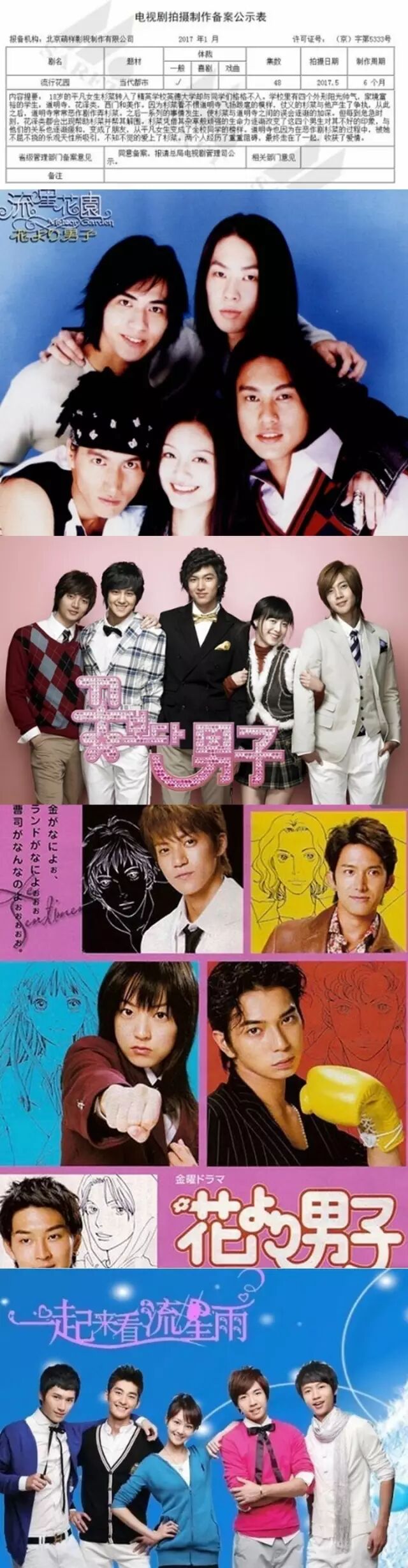 据报道,《流星花园》先后被中国台湾、日本、中国大陆、韩国翻拍后,近期将再度被翻拍。据悉,主要剧情和主角名都没变,不过片名改成了《流行花园》。制作备案中还显示,此剧共有48集,将于2017年5月开始拍摄,制作周期为6个月。消息曝光后,网友们纷纷围观:“做错了什么,要一次又一次被毁童年。”“别拍了好嘛,保留那份杀马特感”。