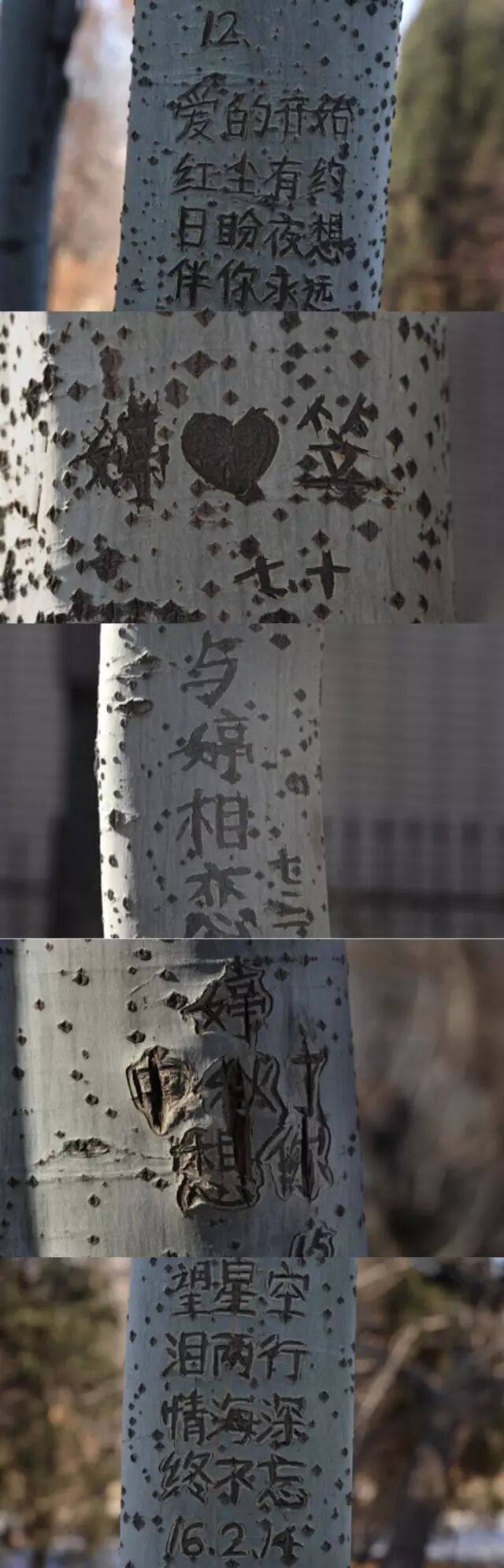 据媒体报道,从2012年到2016年,沈阳新开河一沿河公园,19棵树木先后被刻上一段爱情辛酸史。刻字的人叫“笠”,每逢重要节日和对方生日,他都会在这里刻下对“婷”想说的话。看上去很浪漫,但至今19棵杨树已因此被毁。