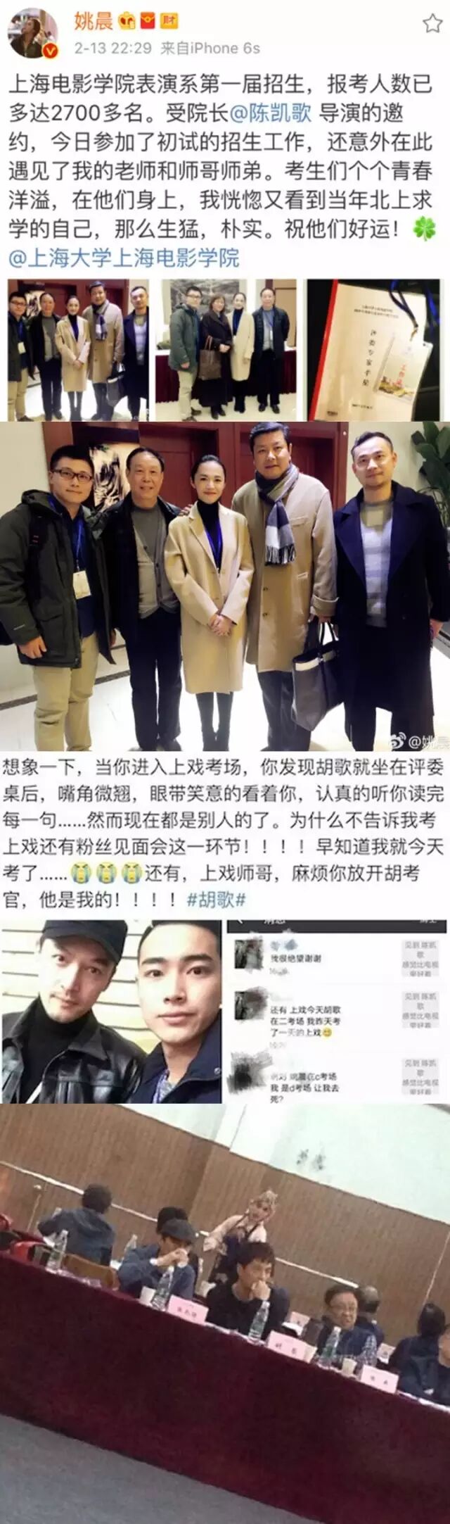 近日,姚晨现身上海大学上海电影学院 ,担任艺考考官。姚晨直言如果考生整容过度,初试就有问题,“对于演员来说,你的脸是你最具表现力的地方,还是应该珍惜它”。另外,胡歌近日也现身母校上海戏剧学院担任艺考考官,一身黑色装扮,短款皮衣配黑色帽子,低调难掩帅气。