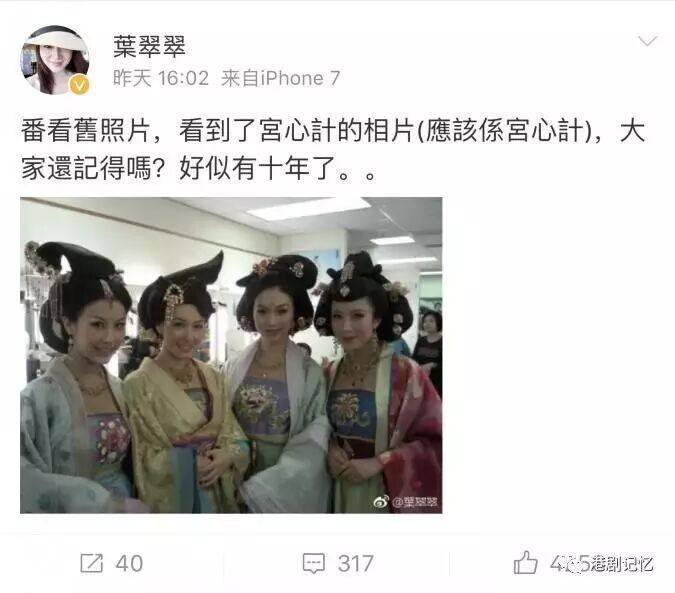 叶翠翠晒与杨怡《宫心计》合影旧照,引网友集体回忆! 港剧记忆 港台女星 2017-07-06 22:35:17 365 创作不易,用心坚持,欢迎请BaGua喝几杯爱心咖啡!打赏并支持本文 打赏并删除本文 7月5日下午,TVB艺人叶翠翠发博称翻出了《宫心计》的旧照片,照片中,叶翠翠与杨怡、曹敏莉、李淑华穿着戏装合影,她配文称:"翻看旧照片,看到了宫心计的相片,大家还记得么?好似有十年了。"此番剧中王贵妃、丽妃,惠妃,贤妃旧照一出,令网友称赞还是老电视剧良心,服装妆容比起现在犹有胜之,部分网友更感叹时光飞逝,当初守在电视机前追剧的日子好像还在眼前,原来戏外已过了这么久了。 创作不易,用心坚持,欢迎请BaGua喝几杯爱心咖啡!打赏并支持本文 打赏并删除本文 感谢您的支持鼓励,我会继续努力的!文章地址:用户邮箱:打赏金额:USDT 请输入数字点击”去打赏“,即可进行打赏支持本文章哦 叶翠翠 About the Author 港剧记忆 功能介绍:港剧,一代人的经典回忆!本账号提供TVB剧集在线观看,TVB人物解读! Related Posts 陈法拉拍摄美容院广告,样貌省镜身型索爆 2018-04-20 12:30:26 钟嘉欣再发福利照,孕妈晒弗爆body! 2018-04-20 12:30:26 周柏豪出新歌《男人背后》!写歌冧太太:佢内心热血沸腾 2018-04-16 22:16:08 当年TVB力捧的「奥运六星」,只剩下2个还未离巢... 无人夺视帝 2018-04-08 22:00:46 47岁古天乐首封影帝!她爆冷获得影后! 2018-03-17 23:09:44 发表评论