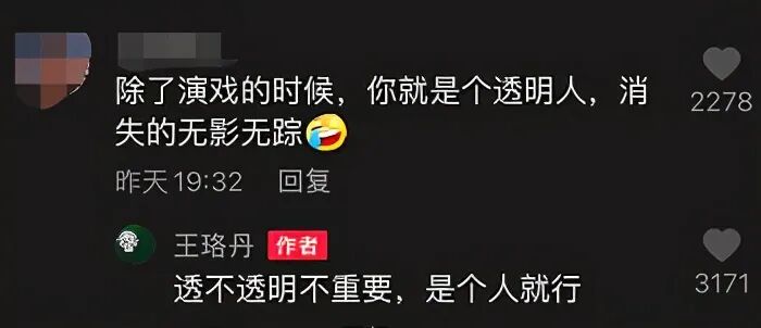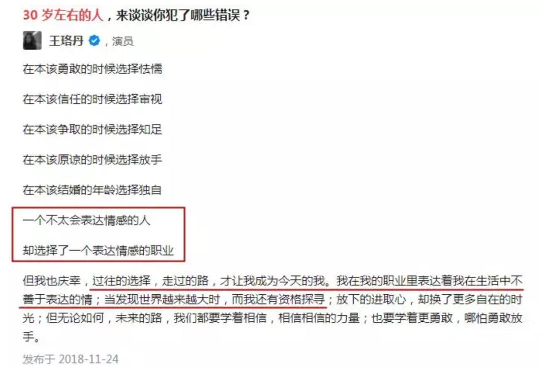 王珞丹亲自回答过:“一个不太会表达情感的人,却选择了一个表达情感的职业。但我也很庆幸,过往的选择,走过的路,才让我成为今天的我。”