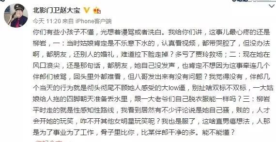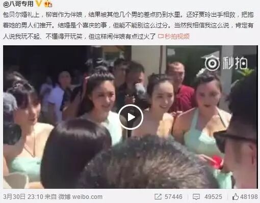 “包贝尔婚礼上,柳岩作为伴娘,结果被其他几个男的差点扔到水里。还好贾玲出手相救,把抱着她的男人们推开。结婚是个喜庆的事,但能不能别这么过分。当然我相信我这么说,肯定有人说我玩不起、不懂得开玩笑,但这样闹伴娘有点过火了”