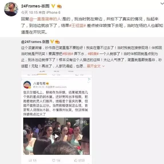 我实在看不过去了!当时我就在接亲现场!伴郎团当时就是开玩笑!要真想把柳岩 弄下水,韩庚一个人就够了!当时伴郎团就是点到为止,到泳池边就停下了!根本没有这个人描述的这样!太让人气愤了,简直就是颠倒是非,吵话题!无耻!再说了,人家玩得起,也愿意玩,关你什么事!
