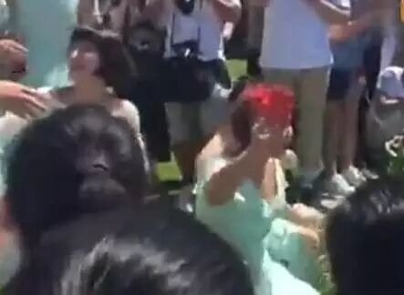 伴娘们当天的穿着都是抹胸纱裙,这样的装扮被如果被扔到水里全身浸湿会是什么效果还用说吗???