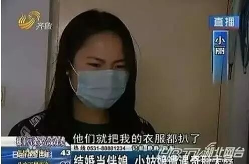 “平生第一次当伴娘让我受尽了屈辱,当时我就发誓再也不当伴娘了,那也是我今生最后一次当伴娘!”桓台起凤镇的王女士说出了自己当伴娘那天所受的屈辱,她当时也想一死了之。“真不愿意再揭开那个鲜血淋淋的伤口……你们呼吁一下吧!别让这个恶俗害人了!”“3年前,在临沂,我朋友的婚礼上,当伴娘的我简直就成了被他们耍的对象,以至于我现在一参加婚礼,心里就紧张,甚至呕吐!”