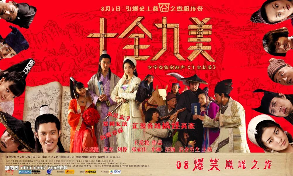 《十全九美》是由王岳伦执导,立威廉、黄奕、刘桦、邓家佳等主演的爱情喜剧影片,于2008年8月1日在中国公映。该片讲述了明朝太子朱笑天醉心木工,却遭到皇帝的坚决制止,带着两个小太监偷偷出宫之后,阴差阳错地与女扮男装的唐小蝶在妓院中相识并成为知己。由于拥有同样的兴趣爱好,两人结伴寻找鲁班奇书《缺一门》,又误打误撞地认识了大富之家的千金南宫燕,随之展开了一段扑朔迷离的三角恋。