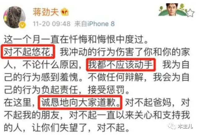 然而这件事在蒋劲夫正式道歉后变成了板上钉钉的家暴,