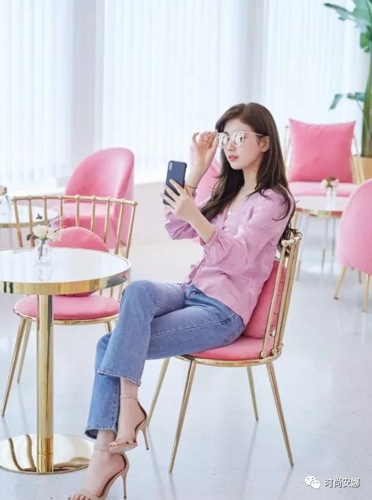 裴秀智身穿粉色的修身雪纺上衣,搭配精致的牛仔长裤。简单大方的穿搭十分的有型,减龄的同时还增加整体穿搭的时尚感,尽显小女生可爱的气质!