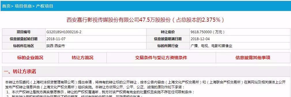 嘉行传媒第三大股东——东方明珠将持有的嘉行传媒部分股权在产权交易所挂牌: