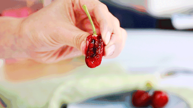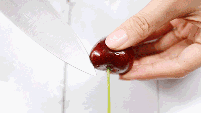 ▲成熟的樱桃都是紫红色,皮薄肉厚,切开能看到汁水特别多,果核很小~