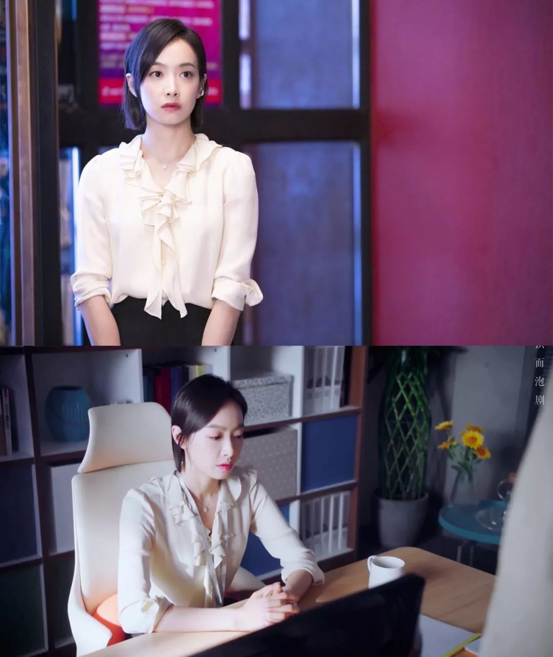 她初次登场时,则穿了一件领口不对称设计的v领白衬衫,自带“天鹅颈”以及“瘦脸”效果。