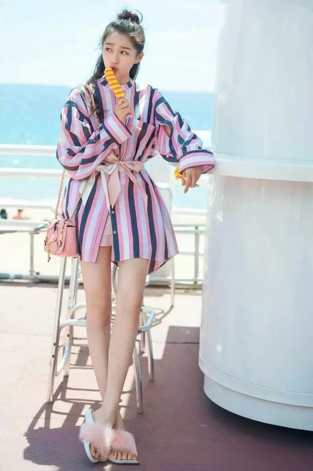 看图没什么问题,粉蓝白三色条纹衬衫,脚踩粉色毛毛拖,中间系粉色腰带,提高下半身比例。