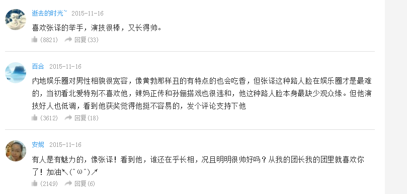 在腾讯娱乐2015年的一篇对张译的专访里,下面评论前三名是这样的。