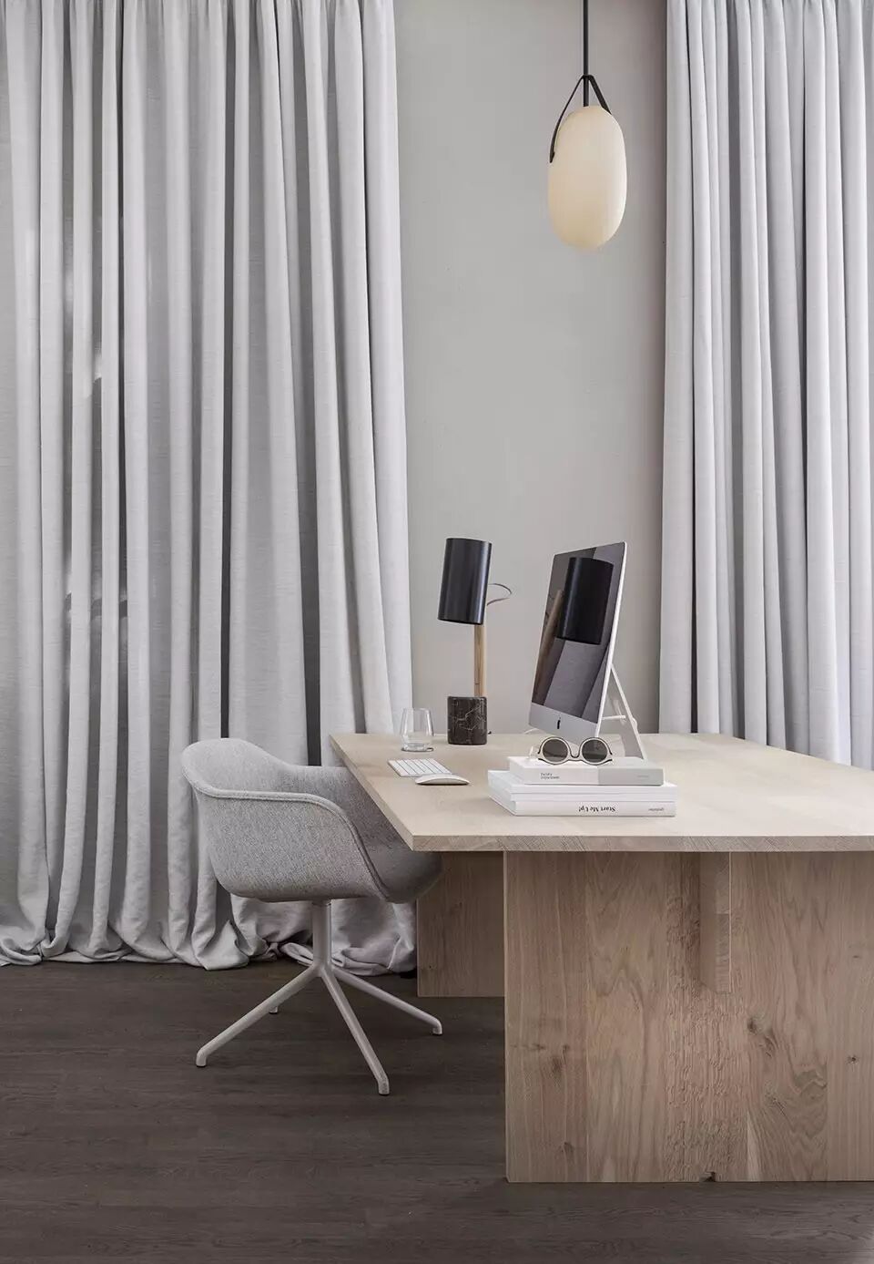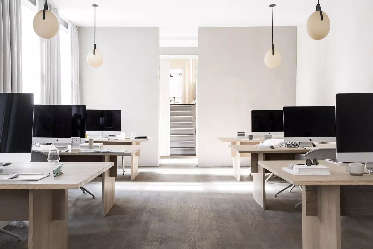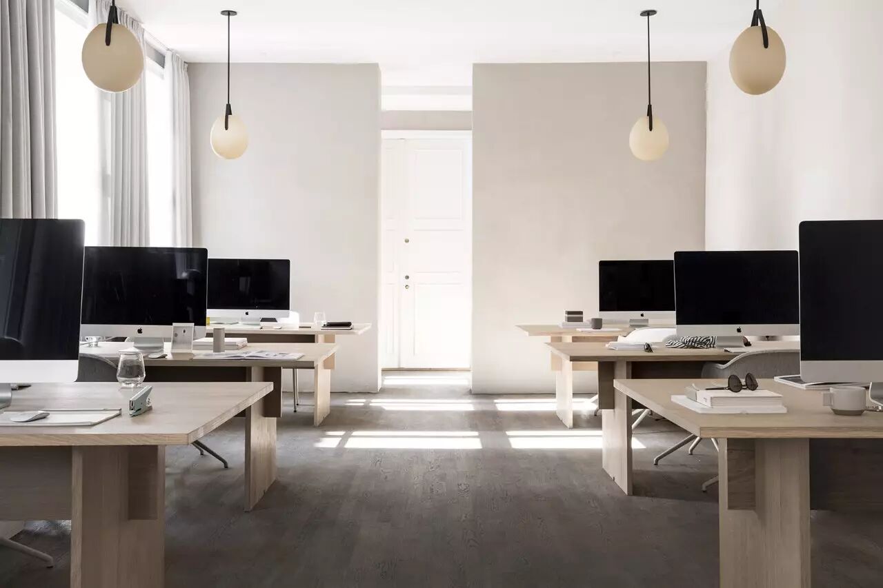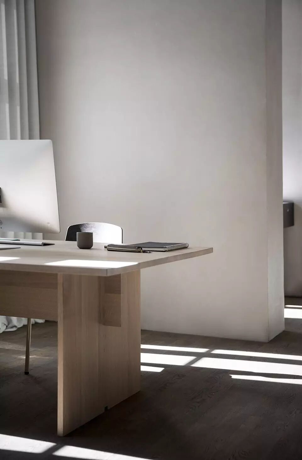 办公室空间内一张张定制的桌子有序的排列,定制桌子的灵感同样来自于日本建筑。所有的木质定制家具使用了丹森橡木材质给空间带来了自然温暖的感觉。严谨的桌子、泥土墙壁、原木塑造的家具、嫩沙色的垂饰和当代设计产品结合在一起,创造了一个优雅、精美利落的工作空间,完全符合Kinfolk的品牌理念。文化和历史、斯堪的纳维亚和日本风格与现代主义以低调细微的方式糅杂在一起符合工作人员的品味和修养。