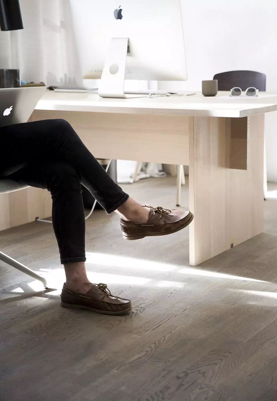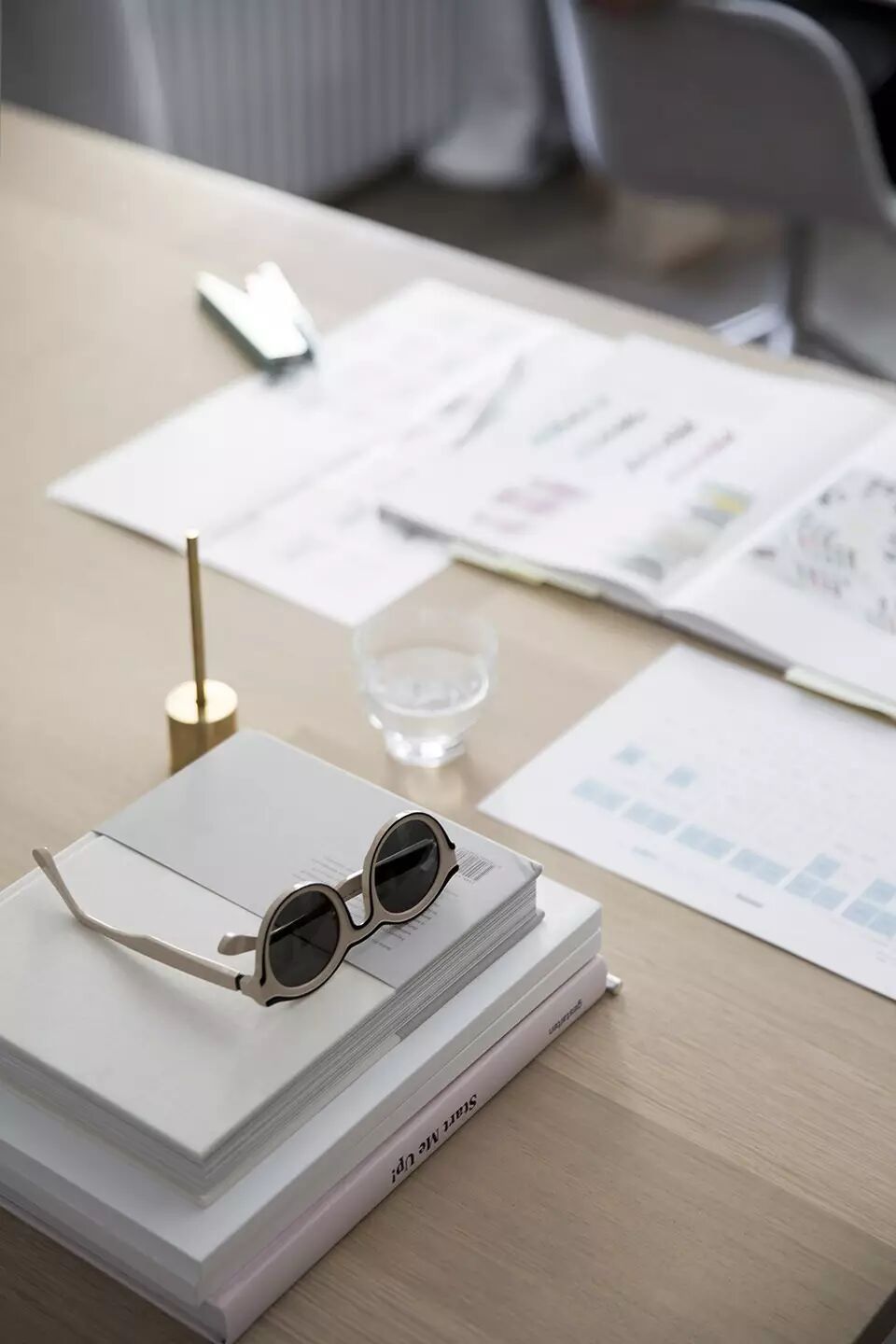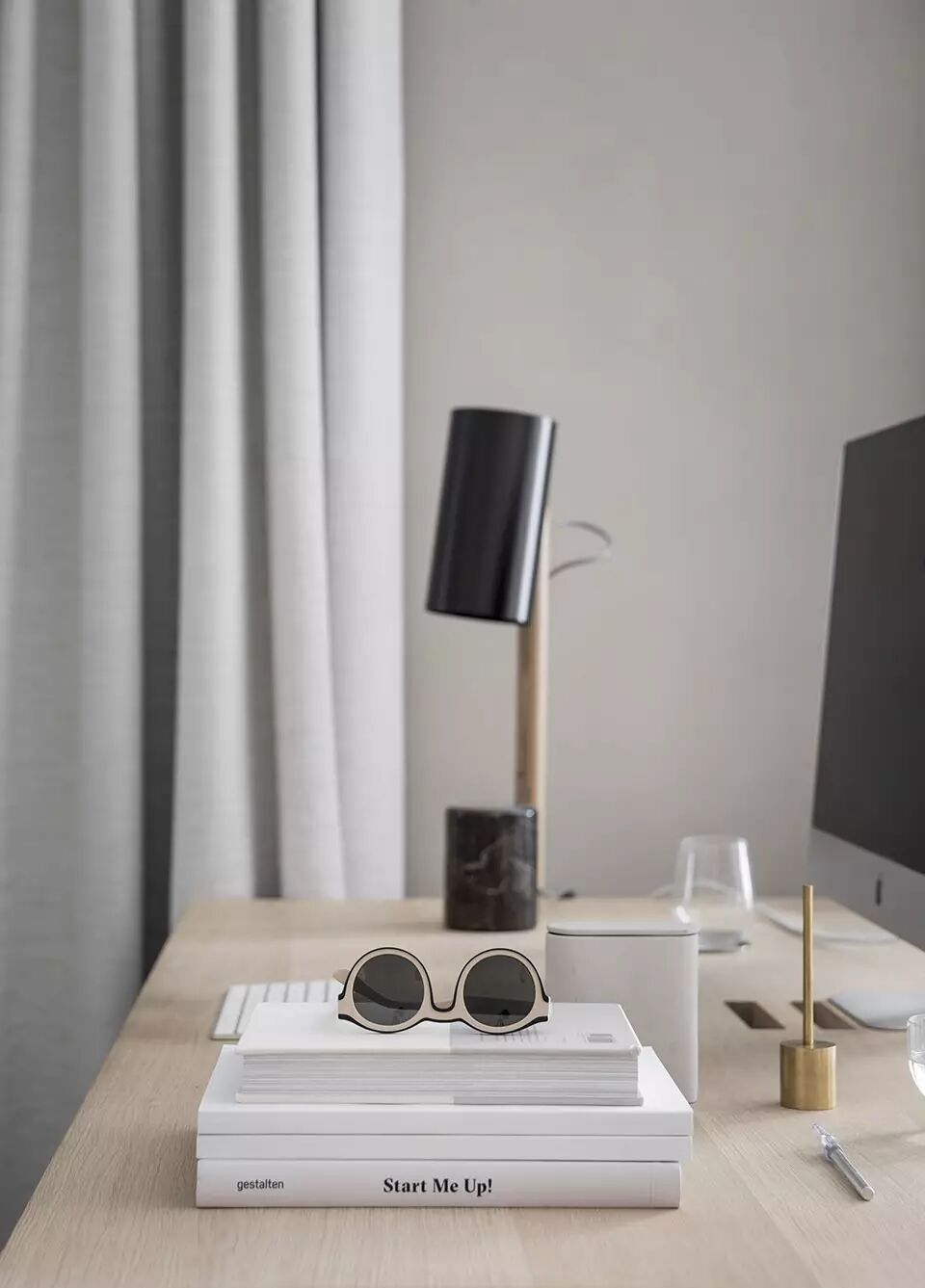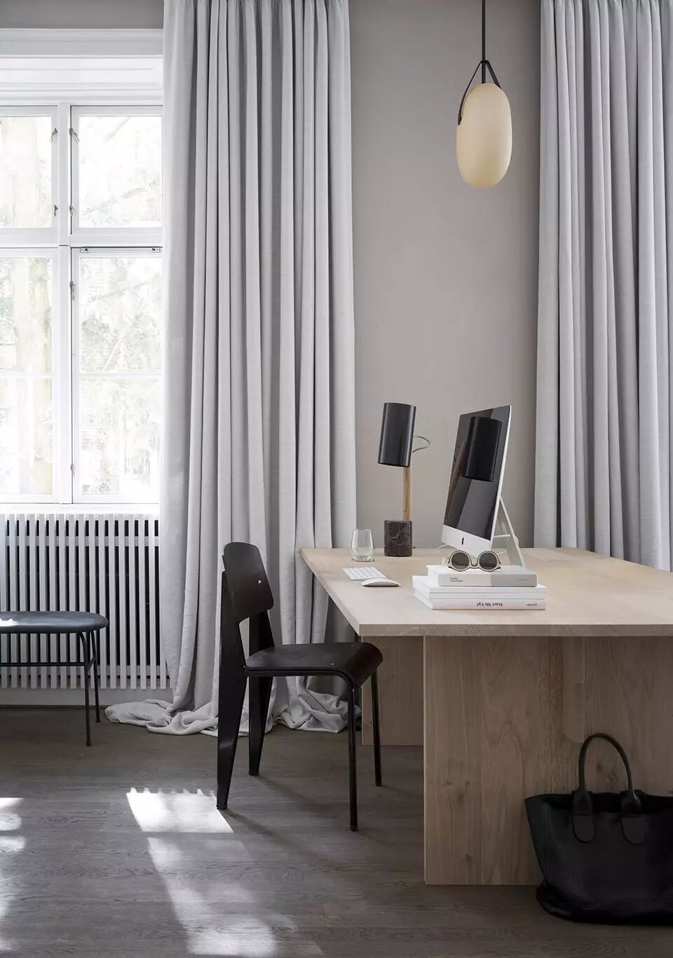 办公室空间内一张张定制的桌子有序的排列,定制桌子的灵感同样来自于日本建筑。所有的木质定制家具使用了丹森橡木材质给空间带来了自然温暖的感觉。严谨的桌子、泥土墙壁、原木塑造的家具、嫩沙色的垂饰和当代设计产品结合在一起,创造了一个优雅、精美利落的工作空间,完全符合Kinfolk的品牌理念。文化和历史、斯堪的纳维亚和日本风格与现代主义以低调细微的方式糅杂在一起符合工作人员的品味和修养。