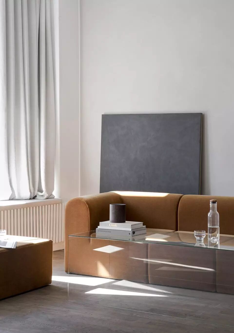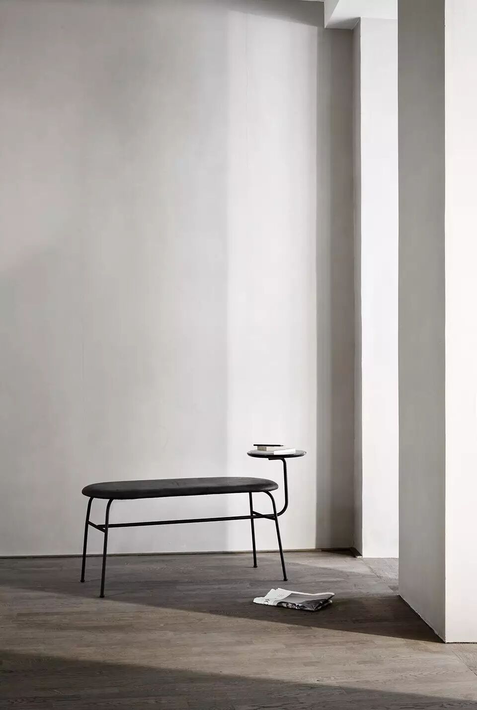 最前面一部分空间,一个高端Nubuk analine皮革索伦森长凳布置在玻璃的一侧,为非正式的工作、会议或冥想Amager Torv的生活提供了可坐的空间。