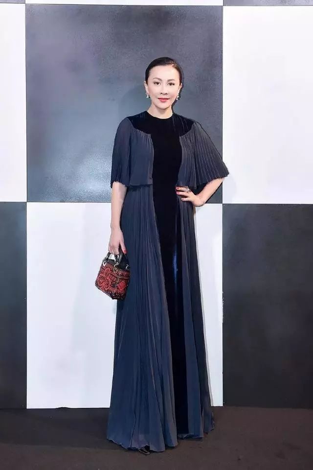 蝴蝶袖的深蓝色礼服裙,中间黑色的拼接高贵又大气!盘起头发让刘嘉玲看上去女王气息十足。手提亮色的小包包,更是增添了亮眼时尚的元素。