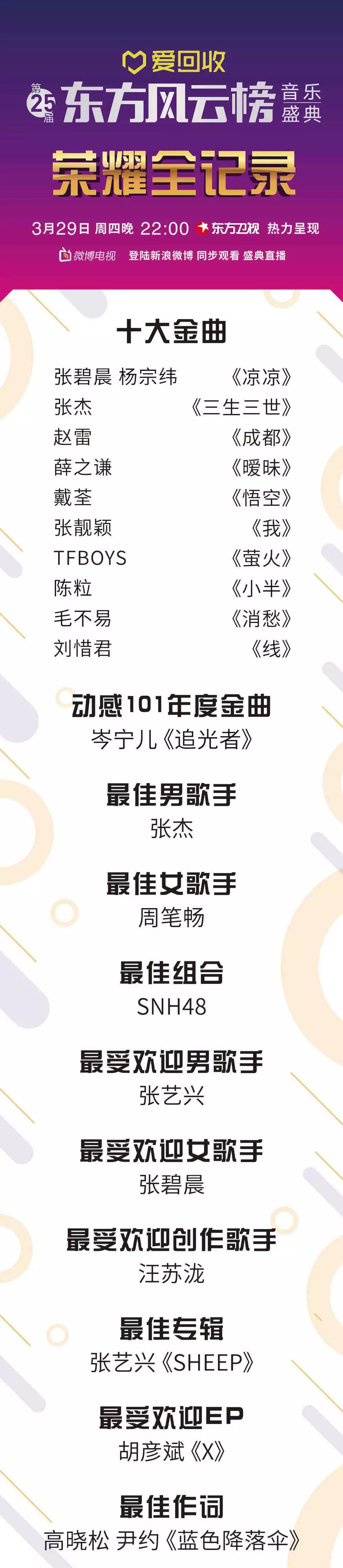 看不过瘾!?3月29日晚22点,敬请锁定东方卫视收看爱回收·第25届《东方风云榜》音乐盛典完整版~为你的爱豆呐喊助威!
