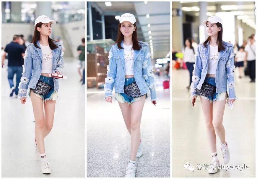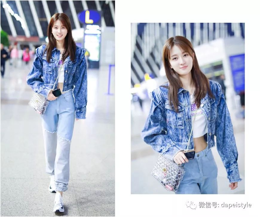 如果说上图中乔欣的秀腰方式还有点保守,那么接下来这身可就大方和自信多了~现身机场时的乔欣,身穿牛仔外套内搭白色短T恤,清凉露蛮腰,隐约还可见马甲线,果真是既性感又养眼呢!