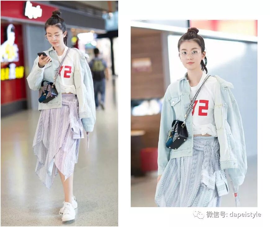 还有她在现身机场时,身穿简约白T下搭不规则半裙,外穿水洗牛仔外套,一身穿扮清爽又时髦。然而重点来了,原来乔欣所穿的T恤本不是短款露腰的款式,却被她特意在腰间打了个结,微微露出腰线更显性感。
