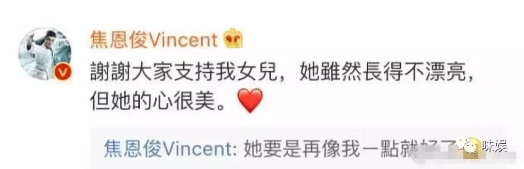 如今,男神焦恩俊的女儿焦曼婷也走进了娱乐圈。焦恩俊虽然疼爱女儿,也实力地坑了女儿一把,发文吐槽"女儿长得太丑",还表示如果女儿能够再像他一点就好了。网友们调侃说"确认果然是亲生父亲!"