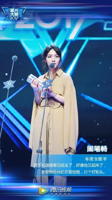 在近日的星光大赏中可以看到很多艺人明星获得了相当高的评价,而其中年度女歌手的奖项也颁发给了周笔畅,在舞台上,周笔畅的发言明显没有自己歌声一样利索,在感谢粉丝的同时还在最后说到“谢谢谢谢杨幂借我的打底”这样让人有些摸不着头脑的话语。