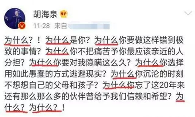 也就在昨两天,陈羽凡的事情被曝光之后,他的搭档胡海泉也同样比较激动,感觉难以置信,身边的好搭档居然做了这样的事情,他连用了几个"为什么"的句子,来质问他,也表达了自己的心痛吧,听起来挺搞笑的,但却很有力的说明了他的知道这件事情之后的惊讶。但是,他知道不知道这件事吗?