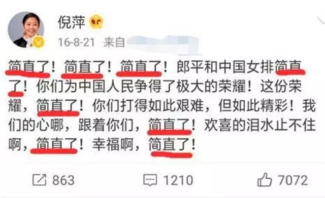 旧事重提一下,因为觉得挺有必要的。很多人喜欢用排比句,应该说特别容易表达自己的情绪了,比如激动的心情,两年前郎平代领排球队拿下了里约奥运会冠军,倪萍激动的用几个排比句表达了她心中那种喜悦的心情。