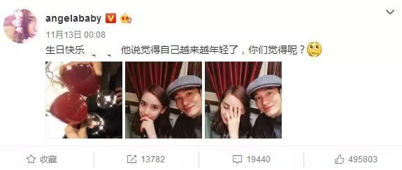 昨天是黄晓明的生日,Angelababy零点刚过就在微博晒合照为老公庆生,还配文:“生日快乐,他说觉得自己越来越年轻了,你们觉得呢?”