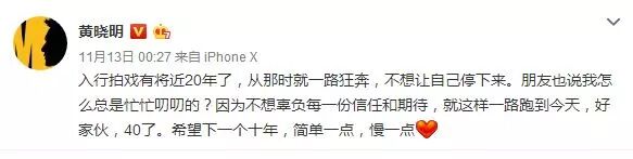 黄晓明还发了另一条微博,感慨自己入行拍戏将近20年,希望下一个十年简单一点,慢一点。