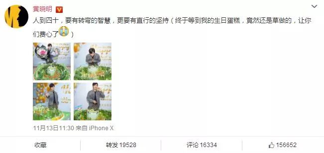 黄晓明本人则发博感慨自己四十了,还调侃自己的蛋糕是草做的。