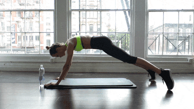 Step 2:以平板撑体作为起始动作,臀部微抬,使得上半身处于水平状态。利用腹部与大腿的力量将膝盖往腹部方向收进来,两边交叉进行。