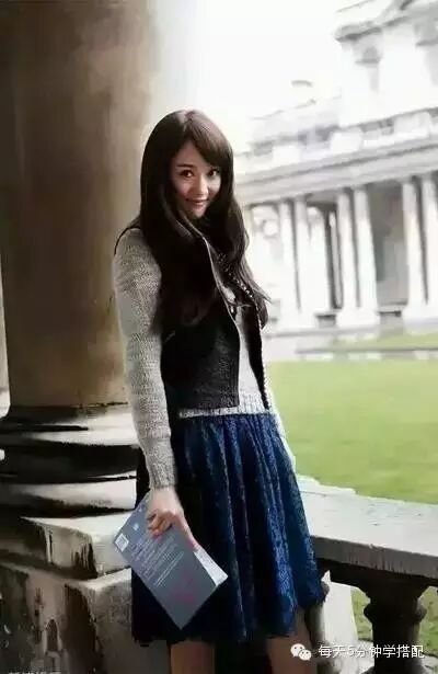 灰色毛衣搭配蓝色蕾丝裙,很常见的穿搭,外套皮衣小马甲,很有层次感。