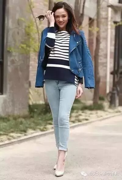 经典的条纹衫搭配牛仔裤,将外套披在肩上,很时尚很有范儿。搭配一双金色高跟鞋,非常潮味性感。
