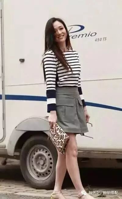 条纹衫搭配军绿色的半身裙,很有海军清新的感觉。豹纹的手拿包,很性感时髦。