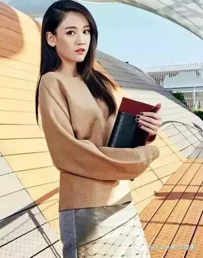 卡其色针织衫搭配拼接款的皮裙,非常时髦有范,混搭的方式,更随性。